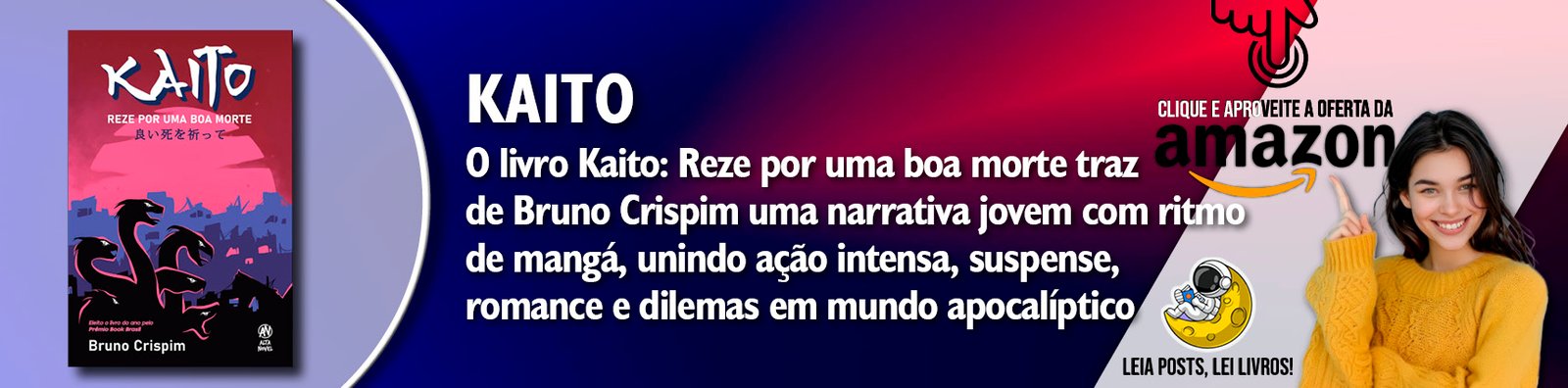 O escritor Bruno Crispim, conhecido por ser finalista no Prêmio Kindle de Literatura com a obra “da morte sua”, lançou durante a Bienal do Livro do Rio de Janeiro (RJ) o livro “Kaito: Reze por uma boa morte”, que foi sucesso de vendas pela editora Alta Books. No universo de “Kaito”, Bruno Crispim aproxima a estrutura dos mangás japoneses da literatura jovem brasileira, em uma narrativa urbana que mescla ação, romance e suspense. O livro está disponível nas principais livrarias do país e também na Amazon Brasil.