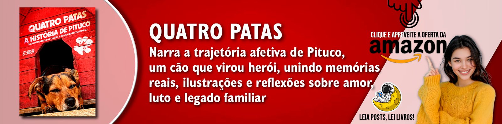 Quatro Patas narra a trajetória afetiva de Pituco, um cão que virou herói, unindo memórias reais, ilustrações e reflexões sobre amor, luto e legado familiar